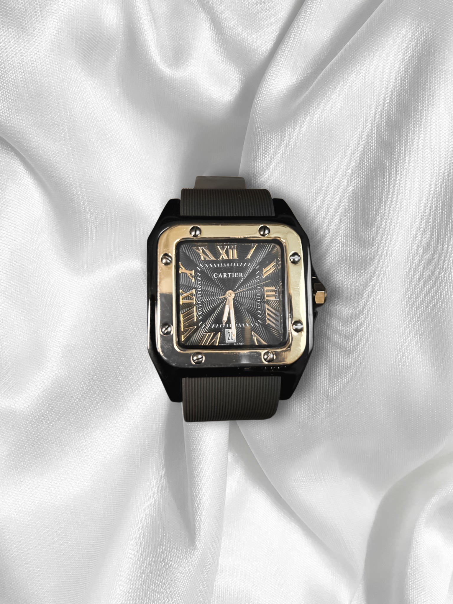 A modern take on a timeless classic — the Cartier Santos Jubilee in Black & Gold delivers luxury with bold sophistication. Featuring a brushed black dial with Roman numerals and sunburst detailing, it’s complemented by a rich gold-tone bezel and durable rubber strap for everyday elegance.